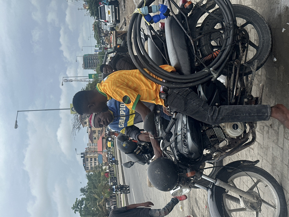 The image captures an outdoor street scene in Dar es-Salaam, Tanzania, under an overcast sky. In the immediate foreground, a dark-skinned adult male is seated barefoot on a black Bajaj Boxer motorcycle. He wears a yellow and green striped shirt with a "Haier" logo on the sleeve and dark jeans. Secured to the motorcycle's rear rack is a large coil of black flexible tubing or cabling, along with a stack of blue and white plastic pipe fittings. Adjacent to him, a second dark-skinned adult male stands, wearing a blue and yellow "CHAMPION" hoodie and a red and white knitted skullcap. He appears to be conversing with the motorcycle rider, with his right hand extended towards the motorcycle's handlebars. In the mid-ground, a multi-lane paved road is visible with active traffic, including multiple motorcycles and several cars. A green tuk-tuk is also present. Along the roadside, various multi-story buildings, some commercial and one appearing to be under construction with exposed framework, are interspersed with palm trees and other tropical vegetation. Streetlights are positioned along the road. The ground surface in the foreground is paved with interlocking bricks, showing areas of dampness.