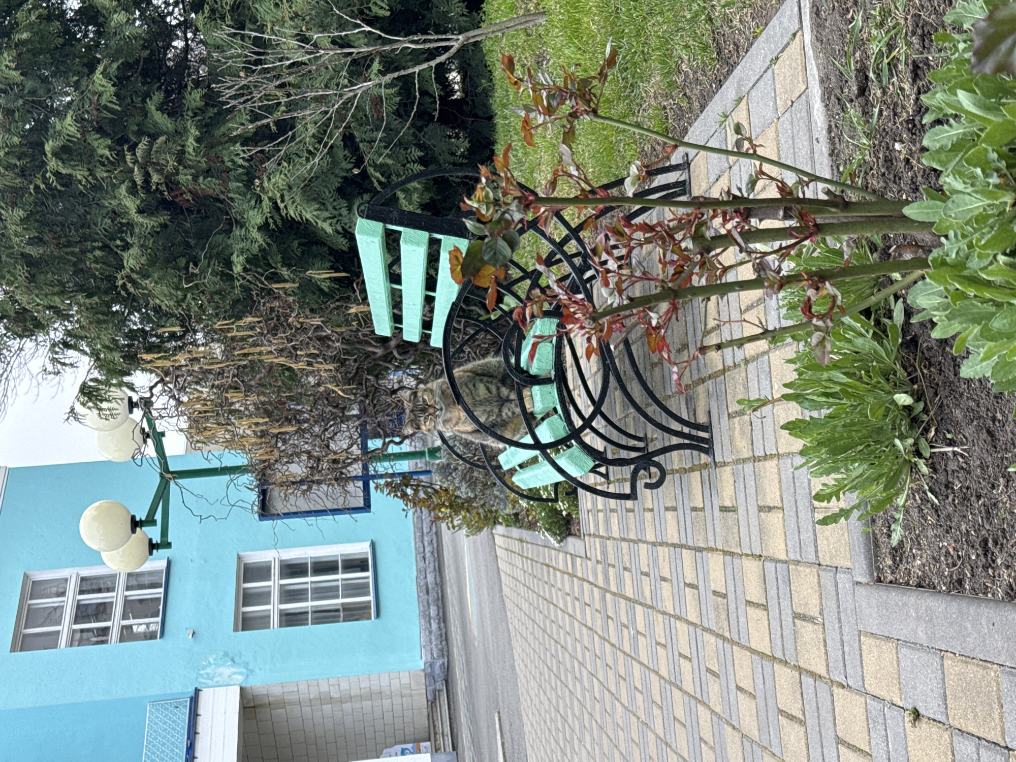 The image depicts a scene in Anapa, Russia, featuring a cat sitting on a green and black bench situated on a brick-paved walkway. The bench is positioned next to a plant bed containing green vegetation. Behind the bench is a light blue building with white-framed windows. A lamppost with spherical lights is attached to the building's facade. Trees and other greenery surround the scene.