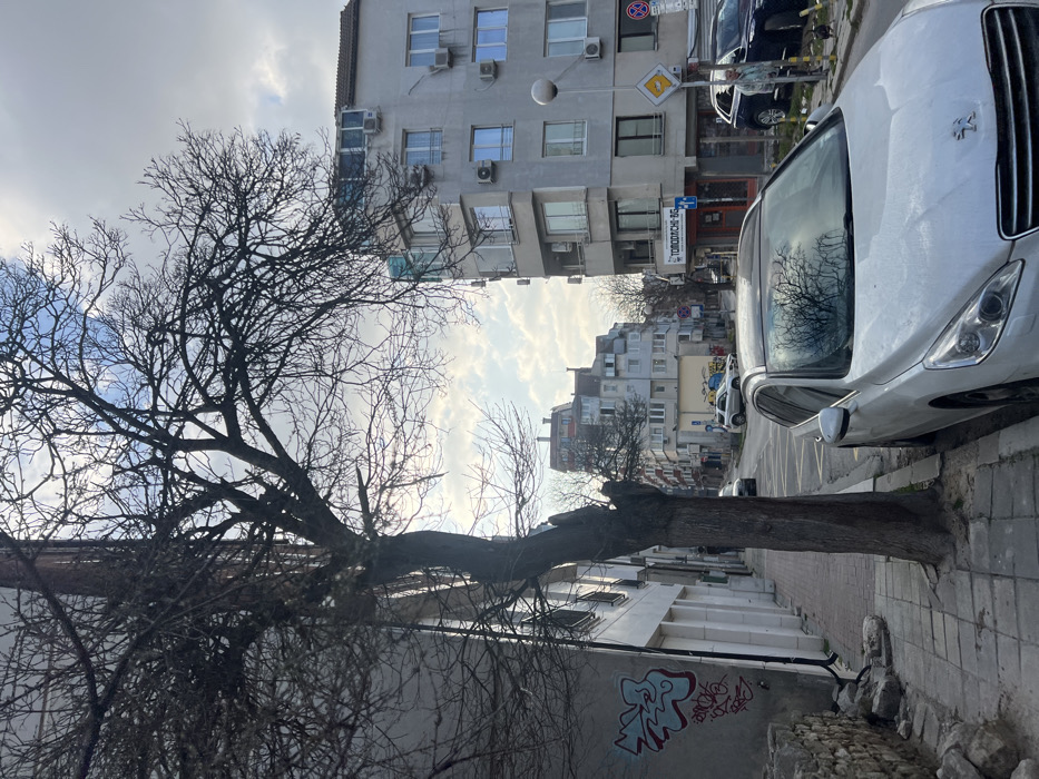 The image depicts an urban street scene in Varna, Bulgaria, specifically at or near Ulitsa "General Kolev" 110, identified by the "ТОМОДАЧИ-BG" sign visible on a corner building. The sky is partly cloudy, suggesting daytime conditions. In the left foreground, a large, bare-branched deciduous tree stands rooted in a small patch of earth on a concrete sidewalk. To the immediate left of the tree, a low stone wall is visible, behind which a building facade features light blue and red graffiti. On the right side of the asphalt street, a silver Peugeot station wagon is parked, facing the viewer. Its windshield reflects the branches of the tree. The street surface exhibits faded yellow cross-hatching markings. Adjacent to the parked vehicle, a street light pole with a spherical luminaire is positioned on the sidewalk. Several traffic signs are mounted on poles in the midground: a blue circular sign with a white right-pointing arrow, a yellow diamond-shaped sign with a white border, and a red circular 'no parking' sign further down the street. The right midground is dominated by a multi-story, grey-painted building featuring numerous windows and external air conditioning units mounted on its facade. The ground floor of this building houses a commercial establishment with a "ТОМОДАЧИ-BG" sign. Further down the street on the right, a dark-colored SUV is parked, with an elderly individual, dressed in a light-colored jacket, standing or walking on the sidewalk beside it. Additional multi-story buildings line both sides of the street in the background, and a white SUV is parked on the left side of the street in the distance.