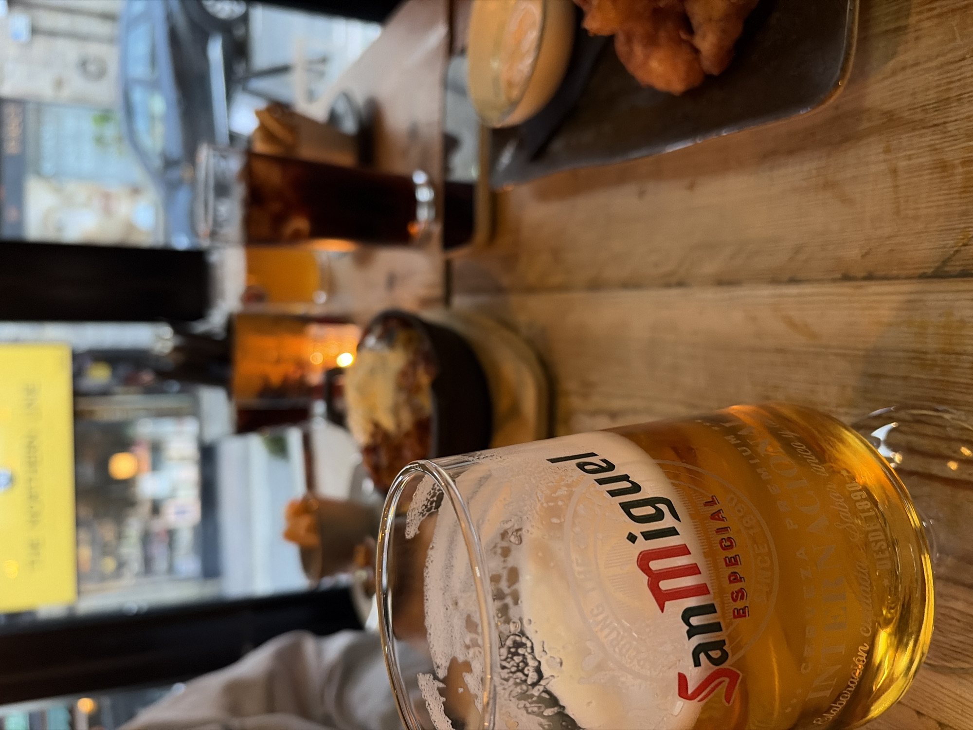 Here's a description of the image: The photograph is taken from a low angle, at table level, likely inside a restaurant or pub, with a focus on a partially consumed glass of "San Miguel Especial" beer