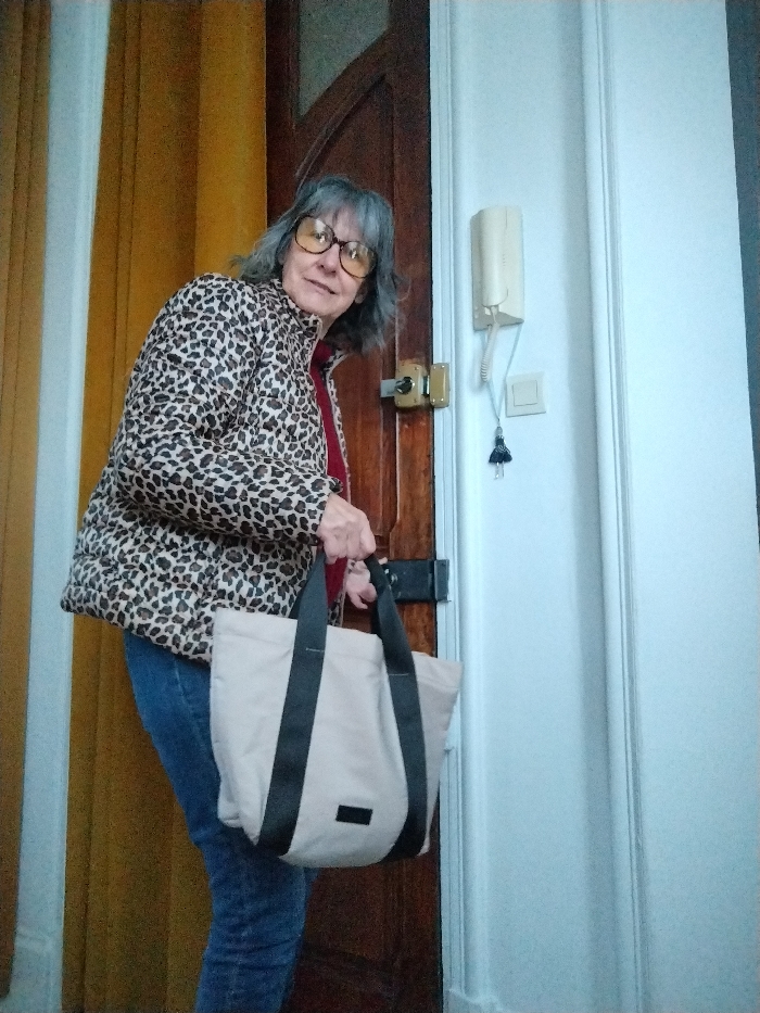 A gray-haired woman wearing a leopard print puffer jacket, jeans, and yellow tinted glasses stands in a doorway. She holds a beige tote bag with black straps. The doorway leads to a room with yellow curtains. To the right is a white wall with an intercom system and a wooden door. The woman is looking at the camera with a slight smile.