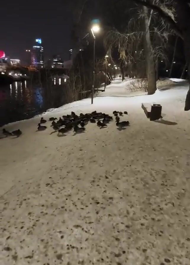 group of ducks in a snowy park at night. The ground is covered with snow, and there are trees in the background. A river or body of water is visible to the left, with lights reflecting on the surface. In the distance, city buildings are illuminated against the night sky. The ducks are huddled together on the snow-covered ground. A street lamp provides light, and a person walks in the distance on the path.