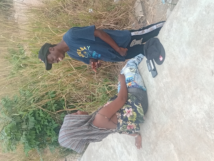 A man and a woman sit outside on a sunny day. The man wears a blue t-shirt, black pants, and a black baseball cap. He smiles, pointing at the woman. She wears a floral shirt, jeans, and a striped headscarf. Two cellphones and a black cap sit on the concrete beside them. Tall grass and some bushes are visible in the background.