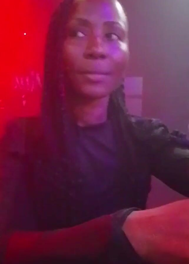 A woman in a black outfit with braided hair is in a dimly lit club or event space with red and purple lighting. She appears to be enjoying the music and dances slightly. A hand touches her forehead briefly. The music is loud. The scene is intimate, focusing primarily on the woman's face and upper body.