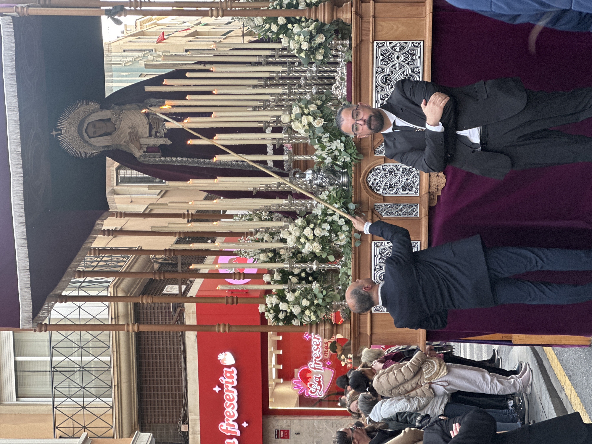 A religious procession is taking place on a city street. A statue of a woman with a crown and robe is being carried, surrounded by numerous candles and white floral arrangements. Two men in suits are near the statue; one is using a long pole to light candles, the other is standing with his arms crossed. A crowd of people is watching the procession. In the background, a storefront with the words "La Freseria" can be seen. The location is assumed to be Alicante/Alacant, Spain, based on the information provided.