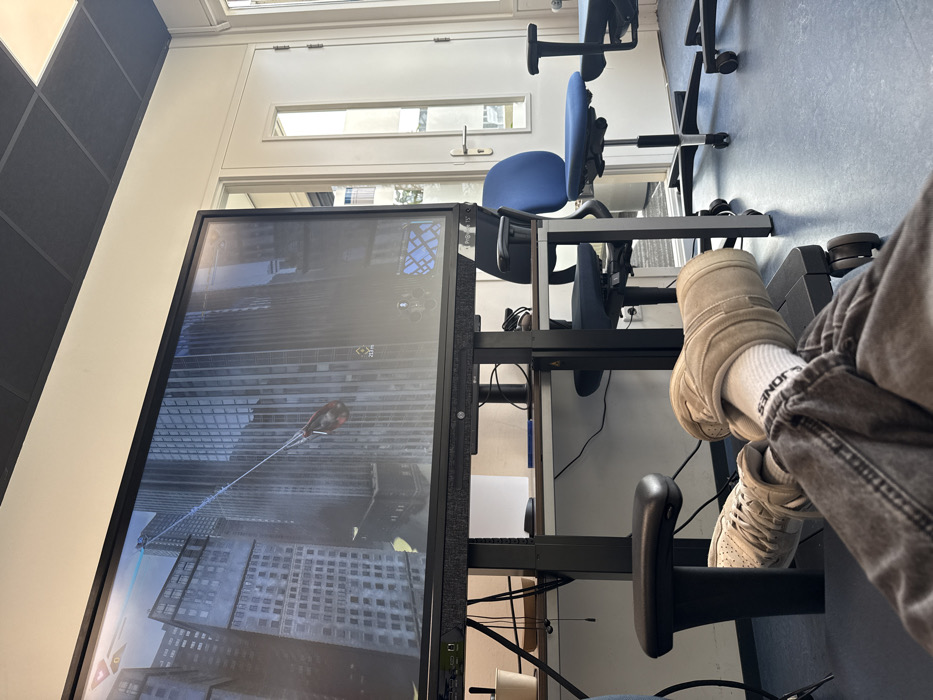 The scene depicts an indoor room in Emmen, Netherlands, from the perspective of a seated individual. The lower legs and feet of this person occupy the foreground; they are wearing dark gray denim jeans, white socks (one displaying 'JONES' text), a light beige slip-on shoe on the right foot, and a white athletic sneaker on the left. Their feet are elevated, resting on a black office chair positioned to the lower left. A large, black-framed digital display screen, mounted on a mobile stand, dominates the central and upper view. The screen displays a video game depicting a character, consistent with Spider-Man, swinging via a web between tall, gray urban skyscrapers under an overcast sky. Game interface elements, including a minimap in the lower right corner and a "213 m" distance indicator in the mid-right, are visible. Beneath the screen, a dark-framed stand supports a light wood-grained shelf. On this shelf are a white disposable cup, a brown bowl, black wired earphones, and a blue rectangular object. The room's environment includes light-colored walls, a ceiling composed of dark gray acoustic tiles interspersed with white light panels, and a blue linoleum floor. To the right, a white door featuring a long, vertical glass panel and a silver handle provides a partial view into an adjacent area or outdoors, showing vertical structures. Multiple blue fabric office chairs with black frames and wheeled bases are visible in the mid-ground and background.