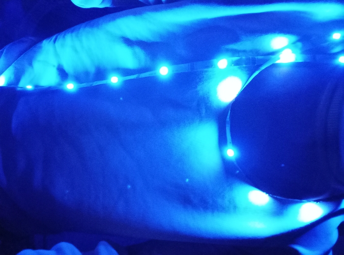 - "A close-up photograph shows blue LED string lights draped across a textured surface, resembling draped fabric or possibly skin" by FM-UTT6r2, licensed under CC BY 4.0