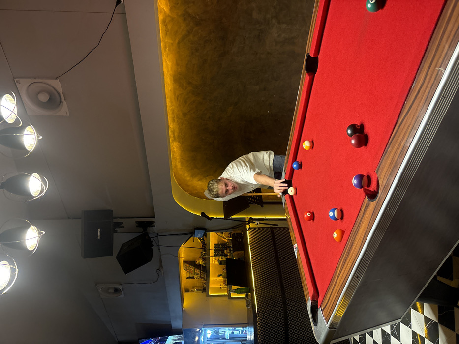 - "An indoor scene in a recreational establishment in Pai, Thailand, features a fair-skinned male with short blonde hair, dressed in a white t-shirt and blue jeans, actively playing billiards" by FM-bmo3E3, licensed under CC BY 4.0