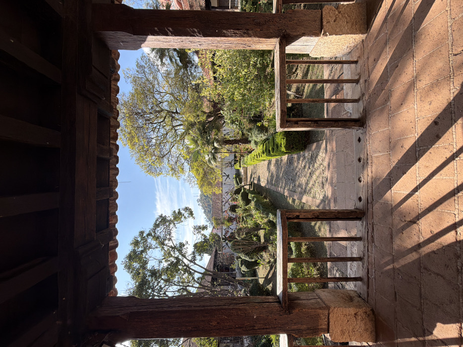 A captivating view unfolds through a wooden-framed opening. Lush greenery dominates, with sculpted bushes lining a stone pathway. A large tree stands tall under a bright blue sky with wispy clouds. The right side of the image features a brick-paved area with strong shadows cast by the railing. The scene exudes tranquility and invites exploration of the garden beyond.
