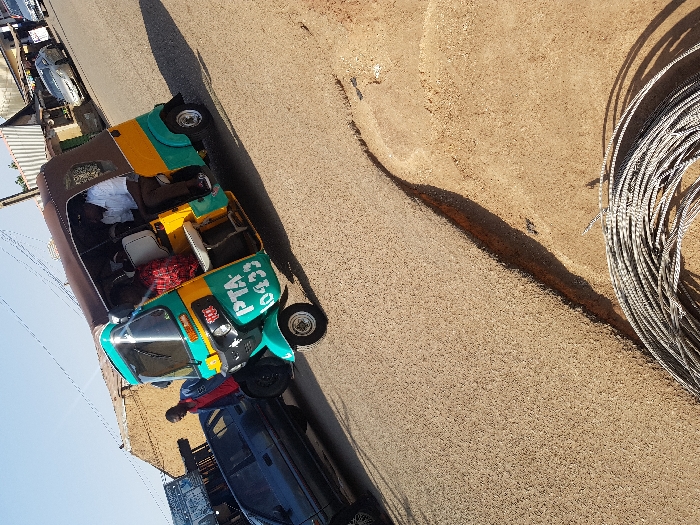 The image depicts a street scene in Jos, Nigeria, during daylight hours. A multi-colored tricycle, predominantly teal, yellow, and brown, is centrally positioned on a paved road, angled towards the right. The vehicle displays the license plate "PTA-0433" on its front. Inside the tricycle, a male driver is seated, wearing a white collared shirt and dark trousers. A female passenger, dressed in a red patterned top, is seated directly behind the driver. To the left of the tricycle, a dark blue sedan is partially visible, with a male individual wearing a blue jacket over a red shirt standing near its front passenger side, facing the tricycle. The road surface is light-colored asphalt, transitioning on its right side to an unpaved, sandy shoulder. In the immediate foreground on this shoulder, a large, tightly wound coil of metallic, multi-strand wire is present. In the background, various single-story structures with earth-toned walls and mixed roofing materials, including corrugated iron, line the street, with several other vehicles visible further along the road.