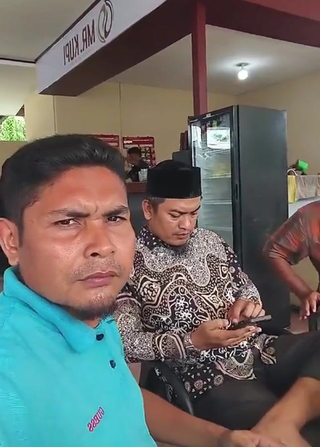 three men sitting at an outdoor cafe. The man in the foreground is wearing a turquoise polo shirt and staring directly at the camera with a serious expression. Behind him and to his right, a man wearing a patterned black and white shirt and a black cap looks down at his phone. To the right of him, another man in a reddish-orange plaid shirt and white skullcap smiles and gives a thumbs-up sign to the camera. In the background, there is a refrigerator, a counter, and other people. The sign of the cafe says "MR. KUPI".