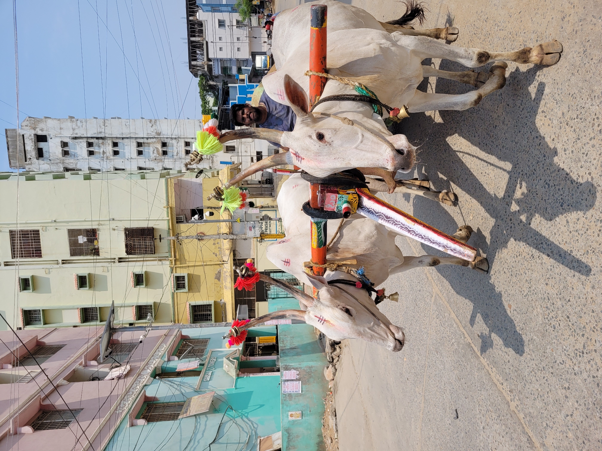 A portrait photograph depicts a pair of white bullocks harnessed together with a man situated between them, positioned on a street in an urban environment. The bullocks are adorned with decorations on their horns and foreheads, and are connected by a yoke. The man appears to be in control of the animals, guiding them along the street. The backdrop consists of multi-story buildings with a mix of architectural styles and colors, suggesting a dense urban setting. The image is shot during daylight hours, with a clear sky and sharp shadows indicating a bright, sunny day. The location appears to be in the city of Unknown, Unknown.