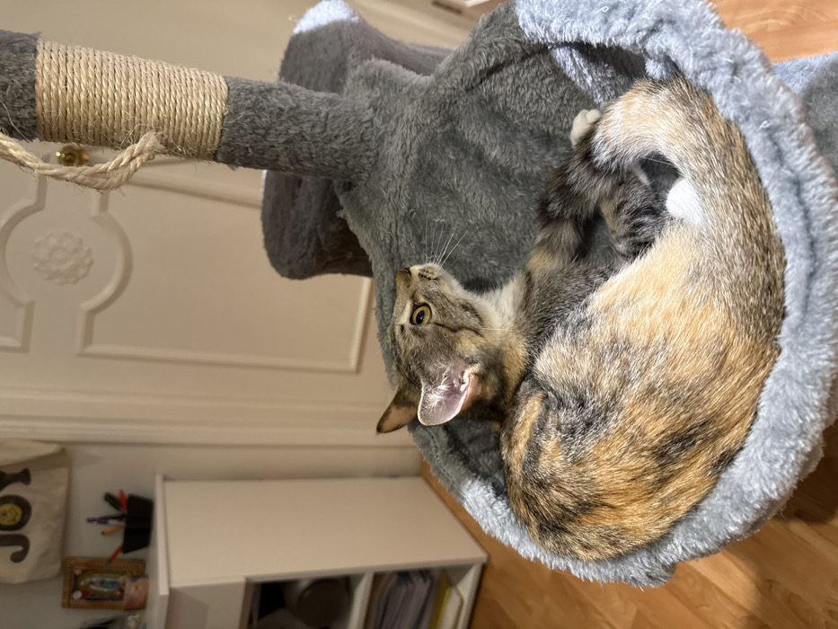 A domestic cat is observed within a multi-tiered cat tree, situated in an interior room in Mexico City, Mexico. The cat, exhibiting a calico-tabby fur pattern with shades of brown, orange, dark grey, and white, is curled inside a circular, plush grey bed on the cat tree. Its head is elevated and oriented towards the upper right, with its eyes focused upwards, beyond the frame. Erect ears and visible whiskers are present. A scratching post, wrapped in natural fiber rope, extends upwards on the right side of the cat tree, featuring a small bell or toy suspended by a string. In the background to the left, a white modular shelving unit contains various items, including stacked documents, a small framed image, and a black holder with pens. A white tote bag bearing the word "JOY" is mounted on the wall above the shelf. A white door with decorative paneling is visible in the background, center-right. The flooring consists of light brown wood or laminate. The environment is illuminated by artificial interior lighting.