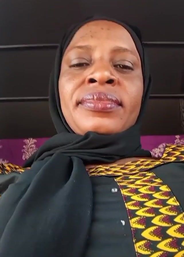 A medium shot shows a woman wearing a black hijab and an African print dress with yellow and red designs on the shoulder area, facing the camera. She is inside a moving vehicle, visible through the windows behind her. The woman's expression is calm and composed. The background includes a purple patterned seat cover. The sound of a vehicle can be heard.