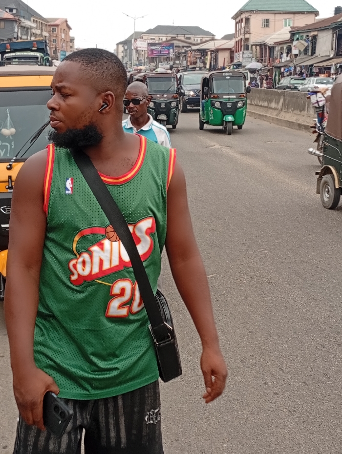 The image displays an urban street scene in Aba, Abia State, Nigeria. In the foreground, a dark-skinned male with short hair and a full beard is positioned slightly left of center, looking towards the left side of the frame. He wears a green sleeveless mesh jersey with red and yellow trim, featuring "SONICS" and the number "20" in red and white lettering, along with an NBA logo. A black wireless earbud is present in his left ear. A black messenger bag with a shoulder strap is slung across his chest. He wears black and grey striped shorts with a white emblem on the right leg and holds a black smartphone in his left hand. Behind him and to the right, a second dark-skinned male with a shaved head and dark sunglasses is partially visible, wearing a light-colored polo shirt. The asphalt road dominates the midground and background, occupied by multiple vehicles. Several green and black motorized tricycles, locally known as Keke Napeps, are prominent in traffic. A dark-colored sedan is visible behind one of the tricycles. Another brown and green tricycle is partially visible on the far right. Along both sides of the street, multi-story buildings with commercial establishments at ground level are visible. These structures exhibit typical urban Nigerian architecture, with various signs, awnings, and utility poles. A large billboard with "MONEY POINT" and "HIPPO" branding is visible in the upper mid-background. A concrete barrier separates sections of the road or sidewalk. The sky appears bright but overcast.