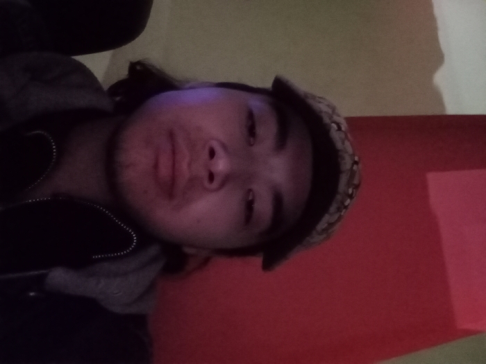 A close-up, head-and-shoulders photograph depicts a single adult male within an indoor setting in Takhtakuprik, Uzbekistan. The subject, of apparent East Asian or Central Asian ethnicity, occupies the central frame, looking directly forward with a neutral expression. He wears a multi-patterned baseball cap, a dark outer jacket, and a grey hooded sweatshirt visible beneath the jacket. Sparse facial hair is present on his chin and upper lip. The background features a wall divided into two distinct color sections: light tan on the left and solid red on the right. The scene is dimly lit, with a subtle blue light source illuminating the left side of the subject's face. No other individuals or significant objects are discernible.