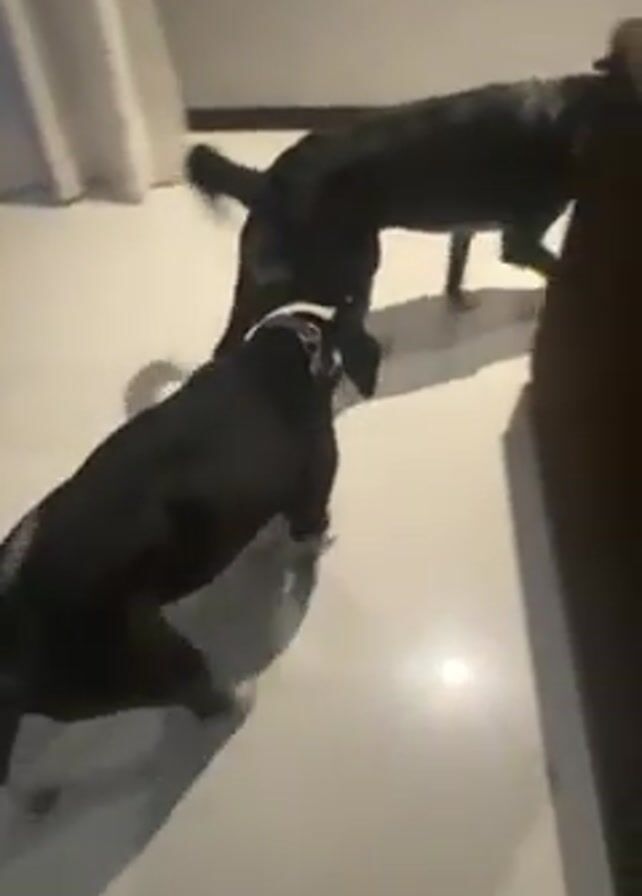 Two black dogs are seen playing indoors on a shiny, light-colored floor. One dog has white markings on its chest and neck. They playfully nip at each other's faces and then run down a hallway. A brown ottoman and a decorative container are visible along the hallway.
