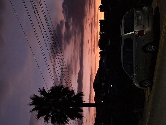 A silver minivan is parked on a paved street in front of a palm tree. It is dusk and the sky is a vibrant red and purple. The van is facing the camera. The location is Socabaya, Peru. The coordinates are latitude: -16.459, longitude: -71.545. The van is parked in front of a row of buildings that are mostly silhouetted against the sky. The palm tree is in the foreground and is in sharp focus. The buildings in the background are out of focus. The scene is peaceful and tranquil. The image is taken from a slightly elevated angle, giving a wide view of the scene. The image is well-composed and the colors are vivid.