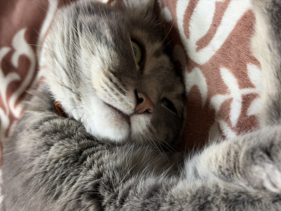 - "A gray tabby cat rests its head on a soft, patterned blanket" by FM-E2SRn1, licensed under CC BY 4.0