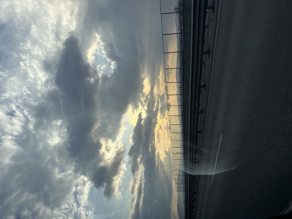 The image displays an elevated highway or overpass, viewed from within a vehicle, likely in the late afternoon or early evening