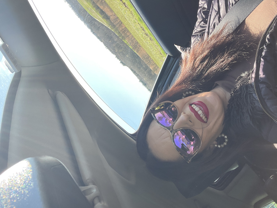An adult female is depicted inside a vehicle, occupying a front seat, in a location consistent with a road near Olingen, Luxembourg. She is seen from the chest up, smiling directly at the camera. She wears large, reflective, purplish sunglasses, obscuring her eyes. Her mouth is open, revealing white teeth and a small stud on an upper incisor, accentuated by dark red lipstick. She has long, dark reddish-brown hair. Her left ear displays a large, circular, possibly pearl-studded earring. She is dressed in a dark, quilted jacket with a fur-like collar, over a brown ribbed top, secured by a black seatbelt across her chest. The vehicle's interior features a light-colored headliner and a rearview mirror visible in the upper left, with bright sunlight reflecting off it. Through the passenger side window on the right, a clear blue sky is visible above rolling green fields and a distant treeline composed of what appear to be deciduous trees without leaves. The reflections in her sunglasses show elements of the car's interior and the external landscape.