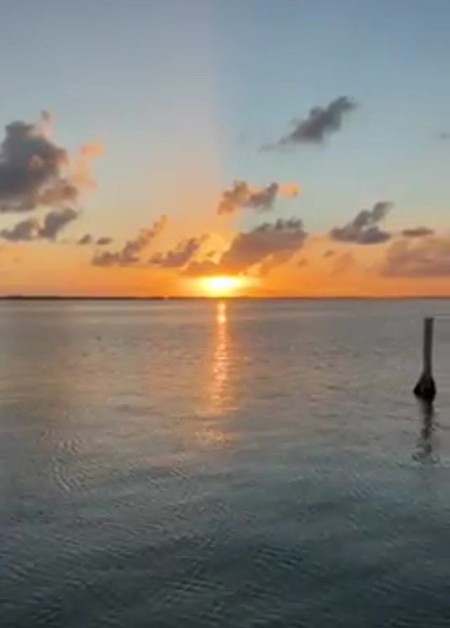 serene waterscape at sunset. The sun, a brilliant orange, hovers near the horizon, casting a shimmering reflection across the calm water. Above, the sky transitions from a light blue to a warm orange hue, adorned with soft, fluffy clouds tinged with hints of pink and orange. In the foreground, two wooden poles stand upright in the water, their bases appearing dark, possibly from seaweed or algae. A distant landmass is visible on the horizon, dotted with faint city lights. The camera pans slowly, revealing more of the landscape and emphasizing the tranquility of the scene.