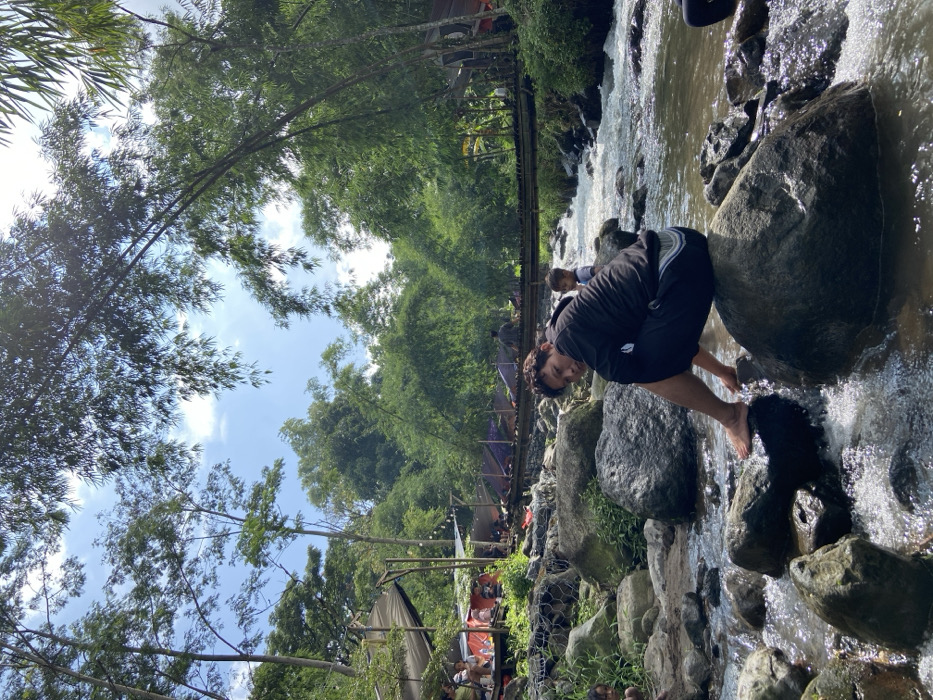 A sideways view reveals a man standing among rocks in a shallow, flowing stream. He wears dark clothing and dips his feet in the water, bending forward with a slight smile. Lush greenery including bamboo shoots surround the stream. In the background, a small footbridge crosses the water, and hints of a gathering with tents and people are visible. The scene is captured under a bright, slightly cloudy sky.