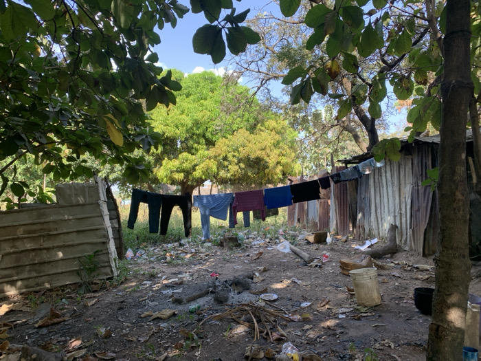 This image captures an outdoor scene in Tataura, Nigeria, under a clear sky with ample daylight. The foreground and midground feature a cleared dirt area with scattered debris, including plastic items, wood fragments, and general refuse. A circular patch of disturbed earth, approximately central, contains remnants resembling ash and small burned wood, consistent with a recent small fire. A clothesline stretches horizontally across the midground, holding various items of laundry. From left to right, two pairs of dark trousers, one pair of patterned blue trousers, one maroon garment, and one dark blue garment are suspended. To the left, a partial structure constructed from weathered, light-colored materials, possibly rough planks or concrete blocks, stands angled into the frame. Along the right midground, a wall or structure composed of severely weathered and corrugated metal sheets extends across the scene. The area is shaded from above by the dense green foliage and branches of several trees, which frame the upper portion of the image. In the background, additional trees with varied green and yellowish foliage are visible, suggesting a natural or semi-natural environment beyond the immediate activity area. Two buckets, one light-colored and one dark-colored, rest on the dirt ground in the right foreground. No individuals are present in the frame.