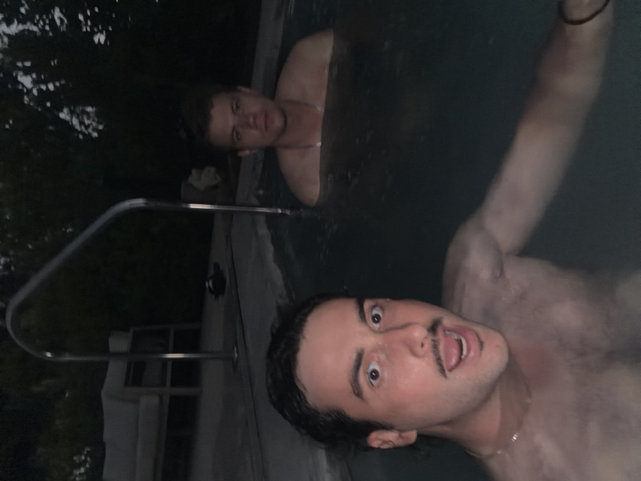 Two men are in what appears to be a hot tub. The man in the foreground has dark hair, a mustache, and is making a wide-eyed, open-mouthed expression. His arm is raised, appearing slightly blurred from motion. Behind him, another man with short hair and a chain necklace is looking at the camera with a more neutral expression. A metal railing is visible along the side of the tub. The background is dark, with glimpses of trees or foliage.