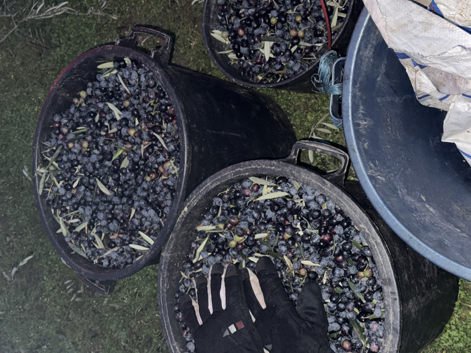 Several buckets, filled with dark-colored olives and olive leaves, are situated on a grassy surface. A gloved hand rests inside the lower right bucket, partially obscuring the olives. The buckets are of different sizes, varying in shades of blue and black. Some have handles. A partially visible white bag is present in the upper right corner, leaning over one of the buckets.