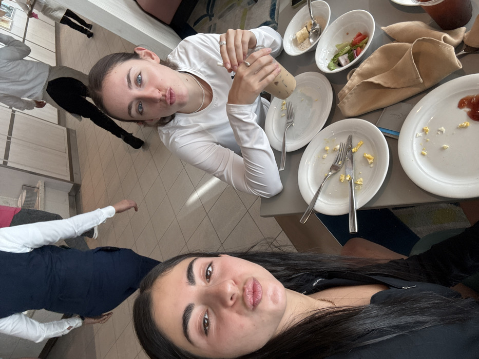 Two young adult females are seated at a gray dining table in what appears to be a restaurant or buffet area, possibly within a hotel or cruise ship