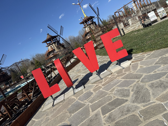 An outdoor, daytime scene in Gorna Malina, Bulgaria, specifically at the "Windmill Park" complex, depicts a landscaped area under a clear blue sky with minimal cloud cover. In the immediate foreground, large, three-dimensional red letters spelling "LIVE" are prominently positioned on a grey flagstone path, casting sharp shadows to the right. Each letter is supported by a dark metal stand anchored to a concrete base. To the left in the midground, a multi-story structure constructed from stone and wood features a large windmill on its roof, adjacent to a complex of wooden framework and a partially visible body of blue water behind a wooden fence. To the right, another similar windmill structure is visible, along with a wooden signpost displaying Cyrillic text including "ЕЗЕРО" (Lake) and "БЪЛГАРИЯ" (Bulgaria). Several informational signs are also present on the right. The background consists of bare deciduous trees. No individuals are visible in the frame.