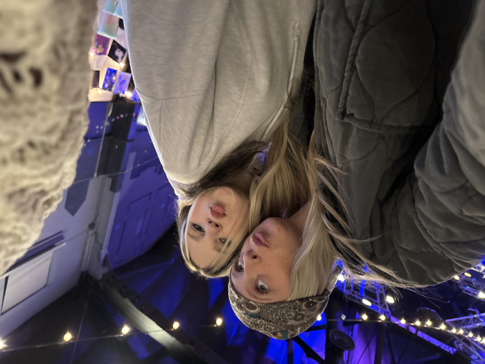 Two fair-skinned women pose closely together in an indoor space lit with blue and white lights. The woman on the left wears a light gray hooded sweatshirt. The woman on the right sports a quilted olive green jacket and a patterned headband. The room's architecture suggests a theater or performance venue with visible support structures, string lights, and photo displays. A blurry, textured object appears on the far left edge of the frame.