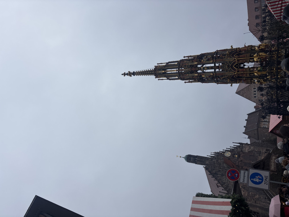 The image displays an outdoor urban scene in Nuremberg, Germany, specifically in the Hauptmarkt