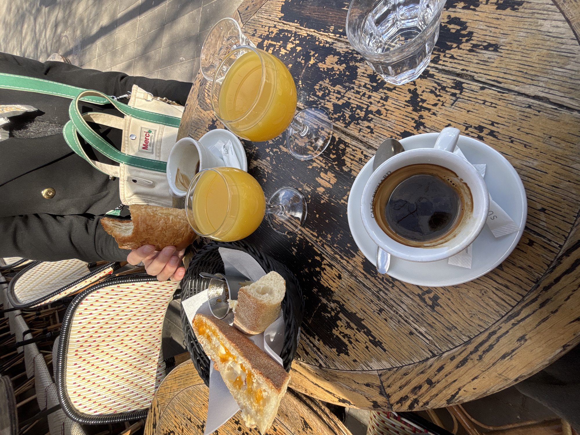 A high-angle shot captures an outdoor café setting, likely in Paris, France, based on the typical French café aesthetics. The table is round and wooden, with a weathered, distressed finish. On the table are: - Two glasses filled with orange juice, with empty glasses beside them. - A white coffee cup on a saucer, complete with a spoon and sugar packets. - A glass of water. - A small, black basket containing slices of baguette, one of which appears to be topped with jam. To the left, a portion of a person is visible, including part of their arm and black jacket adorned with a gold button. Beside them sits a white tote bag with green handles, labeled "Merci." The café seating features wicker chairs. The lighting is bright, suggesting a sunny day.