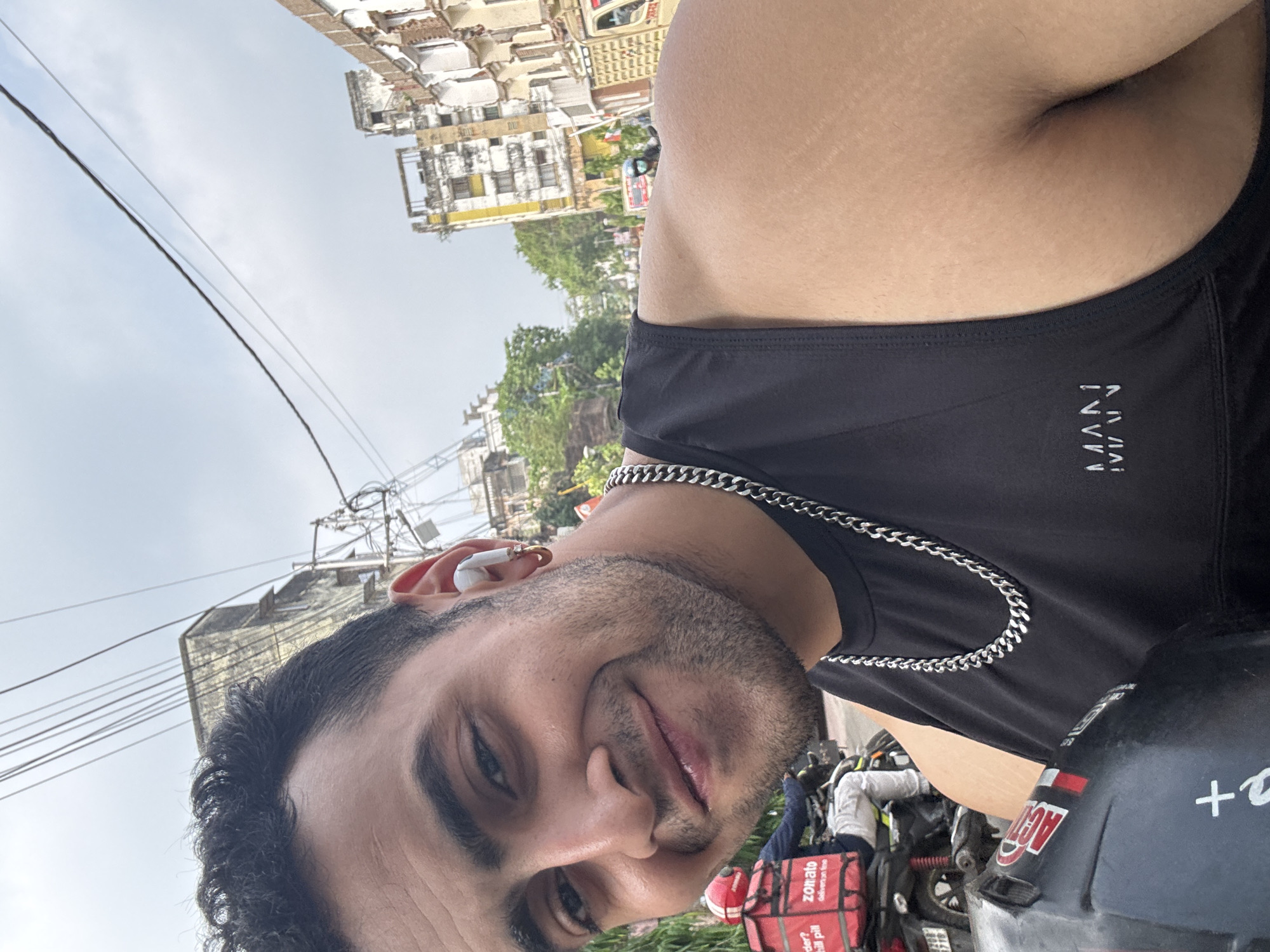 A close-up, tilted selfie shows a man wearing a black tank top with the word "MAN" printed vertically, a silver chain necklace, and earbuds. He is looking at the camera with a slight smile. Behind him is a street scene in Kolkata, India. A "Zomato" delivery person on a scooter is visible. Buildings characteristic of Kolkata are in the background, with dense electrical wiring above. The sky is overcast.