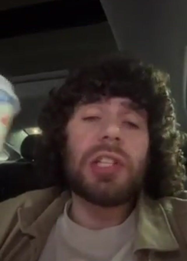A fair-skinned male with curly brown hair and a short beard is seated in what appears to be a car