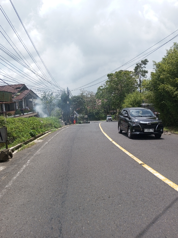 The image displays a paved asphalt road under an overcast sky, curving right into the distance. A black Toyota Avanza (license plate F 1395 YK) is positioned in the right lane, moving away from the viewer. A solid yellow line marks the separation of the visible lane. On the left, an elevated embankment covered in dense green foliage borders the road, with a concrete curb and drainage channel. Behind the foliage, two multi-story buildings with brown roofs are partially visible. A plume of white smoke rises from the vegetation directly in front of these buildings, near two indistinct human figures, one of whom appears to be wearing orange. Numerous overhead utility wires span the scene, connected to poles along the left side of the road. A white car is visible further down the road on the right. The license plate F 1395 YK indicates an Indonesian vehicle registration; therefore, the location is not Chendenbji, Bhutan.