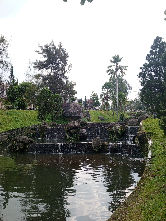 - "The image depicts a landscaped park featuring a multi-tiered artificial waterfall and pond" by FM-JNawk1, licensed under CC BY 4.0