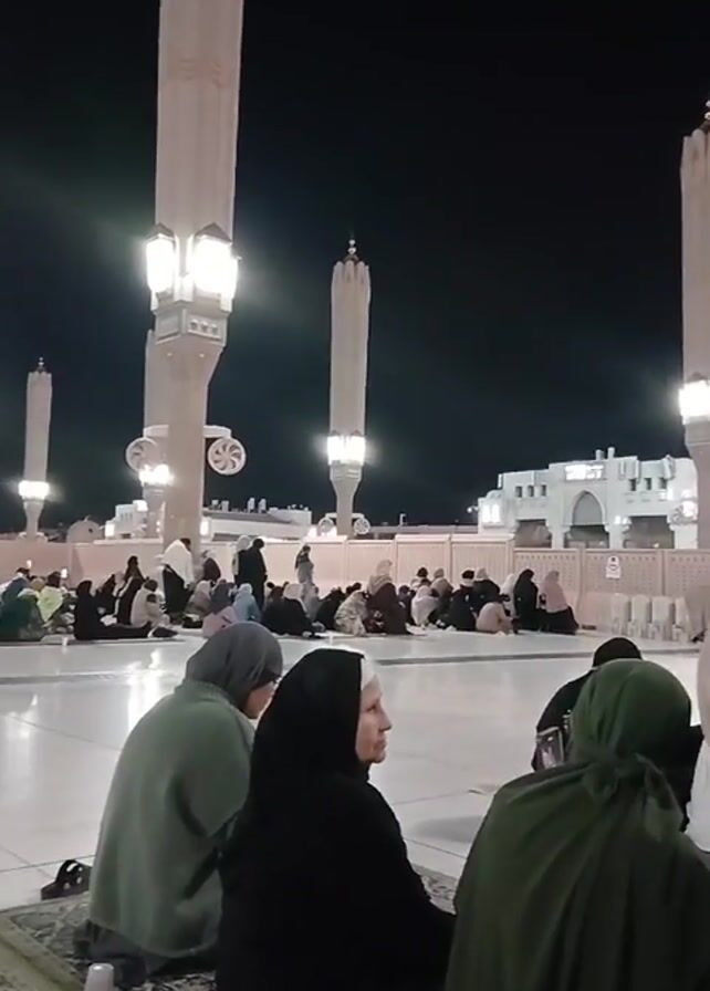 At night, a group of people, mostly women wearing hijabs, are sitting on rugs outdoors. They are in a courtyard of a mosque, as indicated by the tall, illuminated minarets in the background. Some are conversing, while others appear to be listening. The courtyard is well-lit, and the overall atmosphere seems calm and peaceful.
