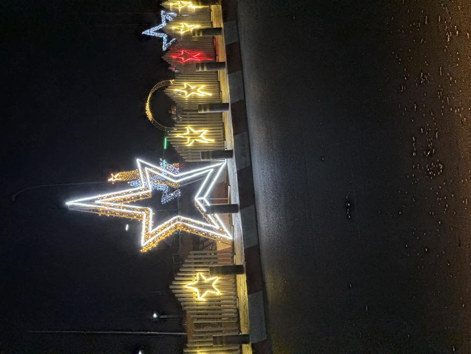 Nighttime streetscape with festive decorations. Illuminated star-shaped lights adorn a building, varying in size and color (white, gold, red, and blue). A crescent moon-shaped light fixture is also visible. The background is dark, with a wet, reflective asphalt road in the foreground. The image appears to be taken from a slightly elevated angle, looking down onto the decorations.