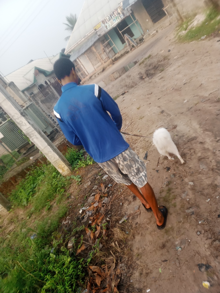 A person in a blue shirt and patterned shorts walks a white goat on a dirt path. They are wearing sandals. The path is surrounded by vegetation and trash. Buildings are visible in the background. The scene appears to be outdoors in a residential area.
