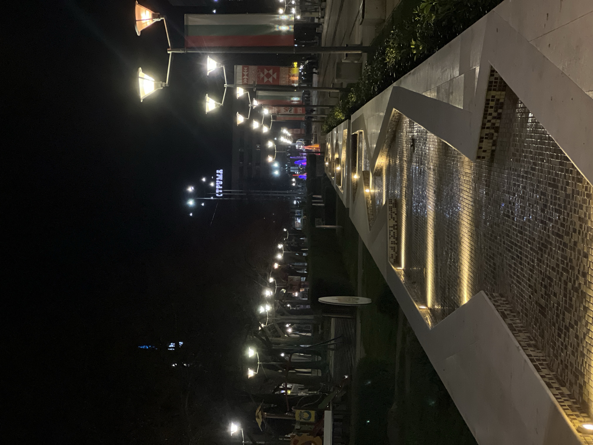 night view of an outdoor area in Pernik, Bulgaria. A decorative water feature is in the foreground with mosaic tiling and integrated lighting. A row of streetlights extends into the distance along a pathway. Flags, including what appears to be the Bulgarian flag, are visible on poles alongside the streetlights. In the background, there is a building with the illuminated word "СТРУМА." Vegetation is present along the edge of the water feature. There are no visible people.