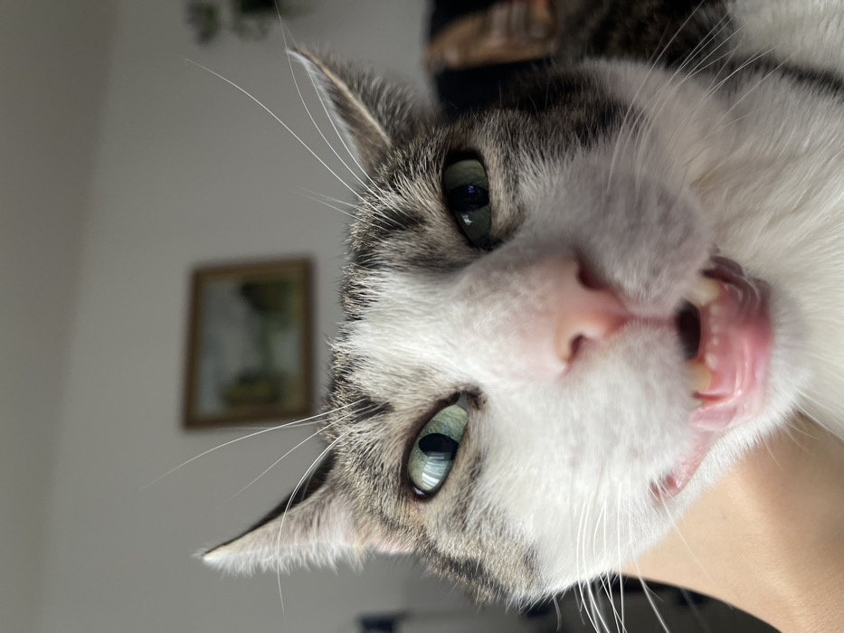 A close-up, eye-level photograph shows a domestic cat, identified as being in Strasbourg, France. The cat, with a tabby and white fur pattern, occupies the majority of the frame, facing directly towards the camera. It possesses green eyes with dilated pupils and prominent long whiskers extending outwards. Its mouth is open, revealing a pink tongue and visible upper and lower teeth. A human hand, with fair skin, is partially visible on the lower left, appearing to support the cat's head. The background is out of focus, consisting of a light-colored wall. A framed picture, likely a landscape painting, is centrally visible on the wall in the blurred background. Additional indistinct objects are present in the blurred background on the right side of the frame.