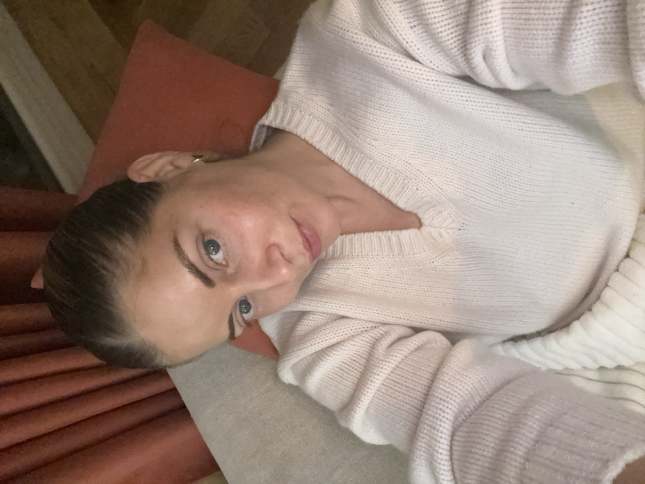 A woman with light skin and blue eyes is lying down, looking at the camera. Her dark hair is pulled back. She's wearing a white V-neck sweater. She is positioned on what appears to be a light gray cushion. A reddish-brown cushion is visible behind her head. The background includes wooden floorboards.