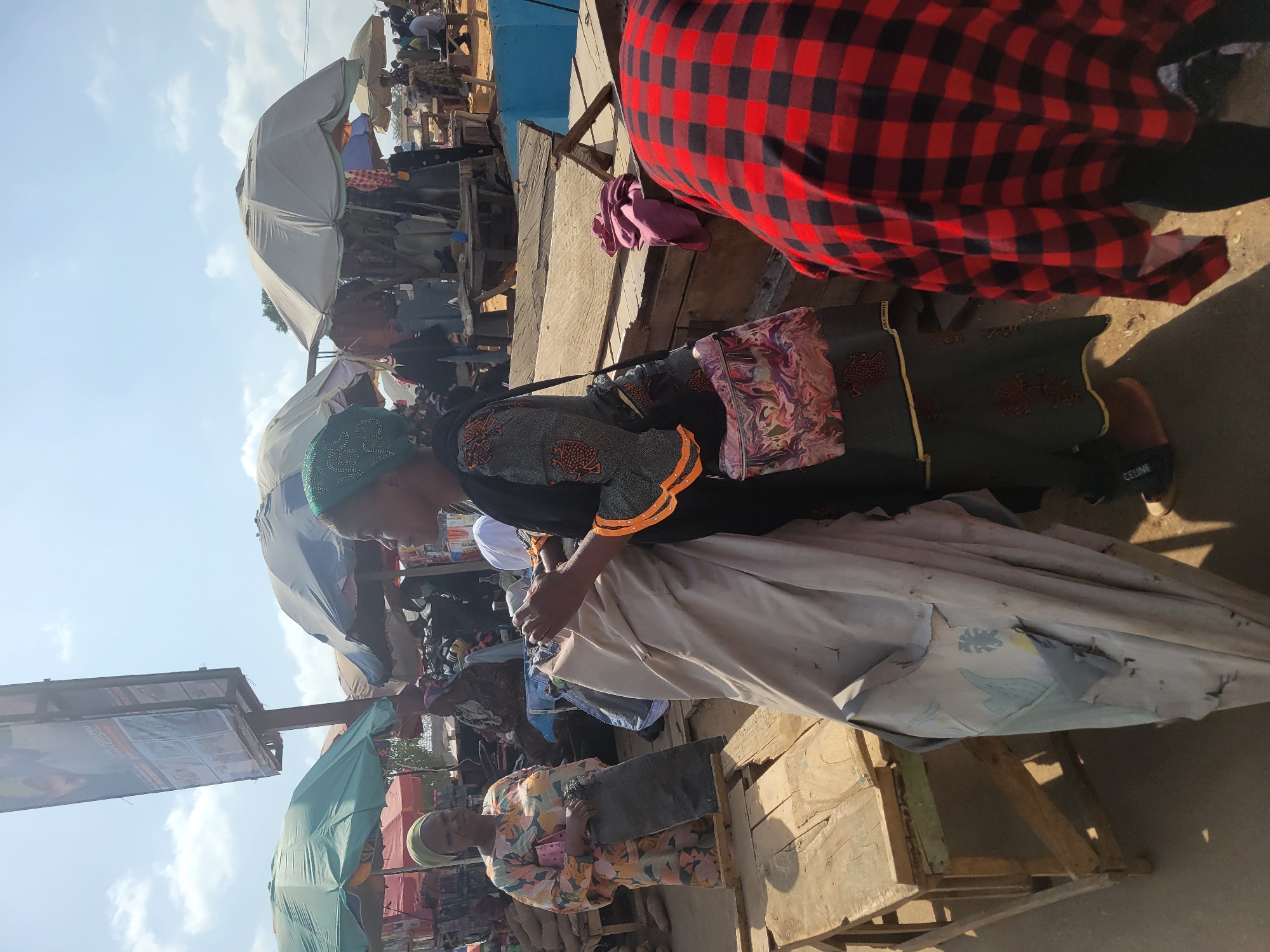 busy outdoor market scene in Madalla, Nigeria. A woman wearing a green patterned headscarf and a dress with orange accents stands at a market stall, appearing to interact with merchandise, possibly fabric, that is partially covered by a white sheet. Another woman, wearing a floral-patterned dress and a light green head covering, is seen near the bottom of the frame, also possibly engaging in commerce. Above them, several individuals are under the shade of umbrellas, suggesting they are either vendors or shoppers. The market setting includes makeshift tables and stalls, with a variety of goods presumably for sale. A red and black checkered cloth or garment is partially visible in the upper right corner. In the background, an advertising sign or billboard is present, against a bright sky with scattered clouds. The overall impression is of a bustling marketplace during the day.