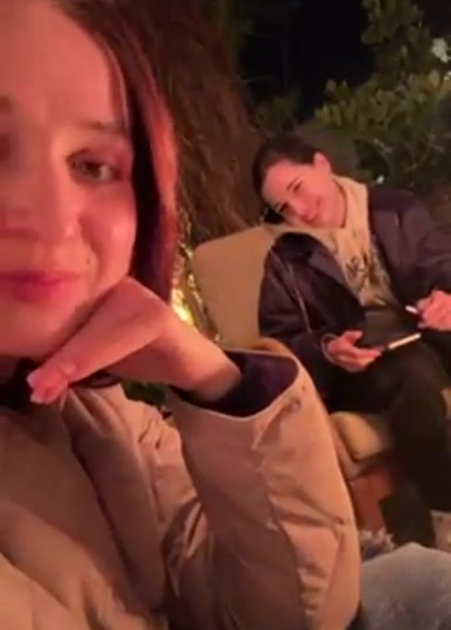 Two women are visible in a dimly lit outdoor setting at night. The foreground focuses on a woman with light skin and pink-tinted hair, who is looking directly at the camera, resting her face on her hand. She is wearing a beige puffer jacket and jeans. Behind her, seated in a chair and slightly out of focus, is another woman with darker hair who is wearing a navy jacket over a hooded sweatshirt and black pants. She appears to be holding a small electronic device. The background includes trees and dimly lit foliage, suggesting they are in a garden or patio area. The overall ambiance is casual and relaxed.
