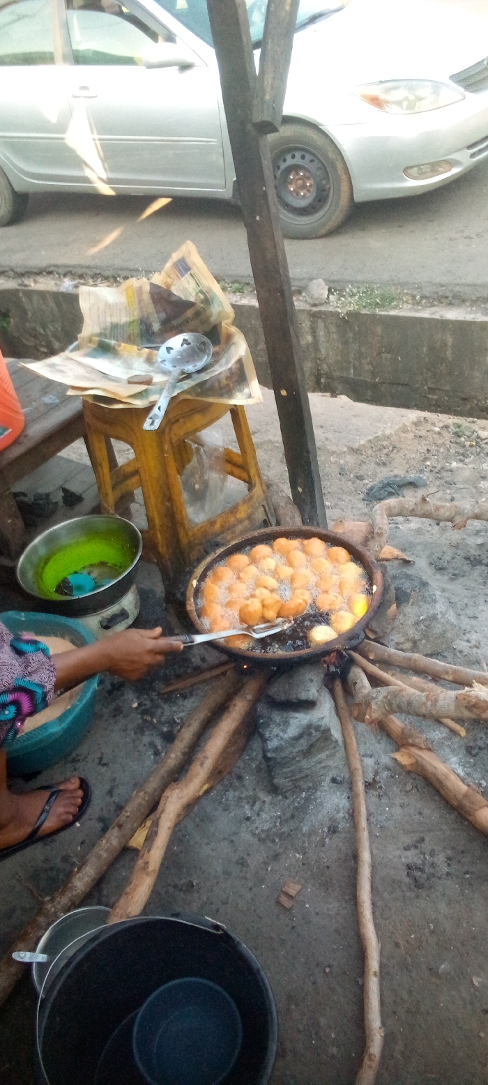 A woman fries puff-puffs in a large pan over an open fire supported by logs. The background shows a silver car parked near a gutter. Next to the cooking area is a yellow stool with newspapers and a slotted spoon on top. Other utensils and buckets are near the cooking fire. The scene appears to be an outdoor food preparation setup.