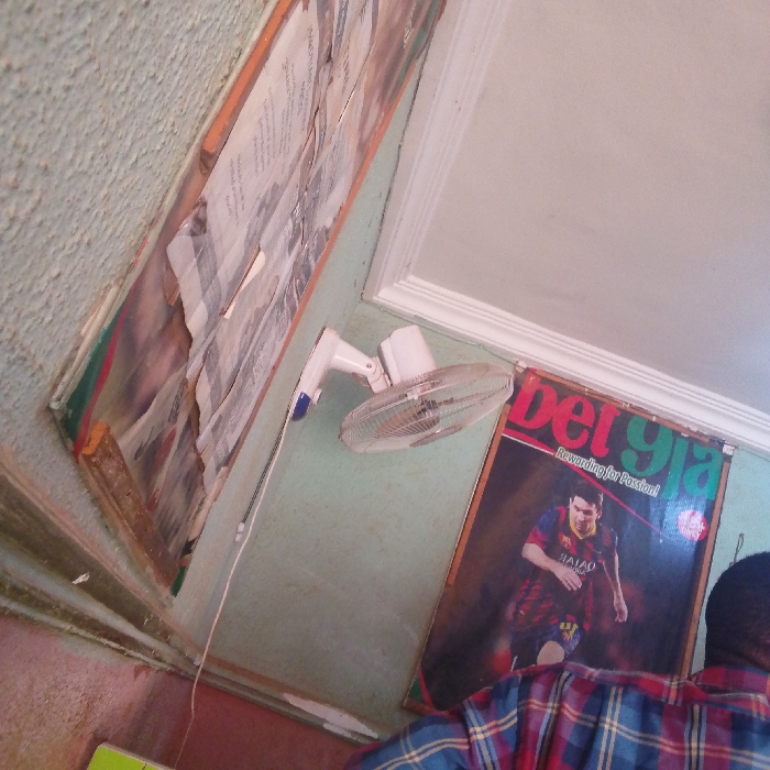 The image depicts an interior room in Sabon Tasha, Nigeria, observed from a tilted, upward angle. A person is partially visible in the lower right quadrant, seen from behind, wearing a red, blue, and black plaid shirt. The room features textured light green walls and a white ceiling with decorative crown molding. A white, wall-mounted oscillating fan with a blue accent is affixed to the right wall, below the crown molding. Beneath the fan, a large framed poster is mounted, showcasing footballer Lionel Messi in an FC Barcelona jersey, with "bet9ja" and "Rewarding for Passion!" text visible. On the left wall, a long, horizontally oriented wooden frame contains multiple layers of aged, torn papers or newspapers. A white electrical cord extends vertically down the right wall. A light green surface, likely a piece of furniture, is partially visible in the lower left corner.