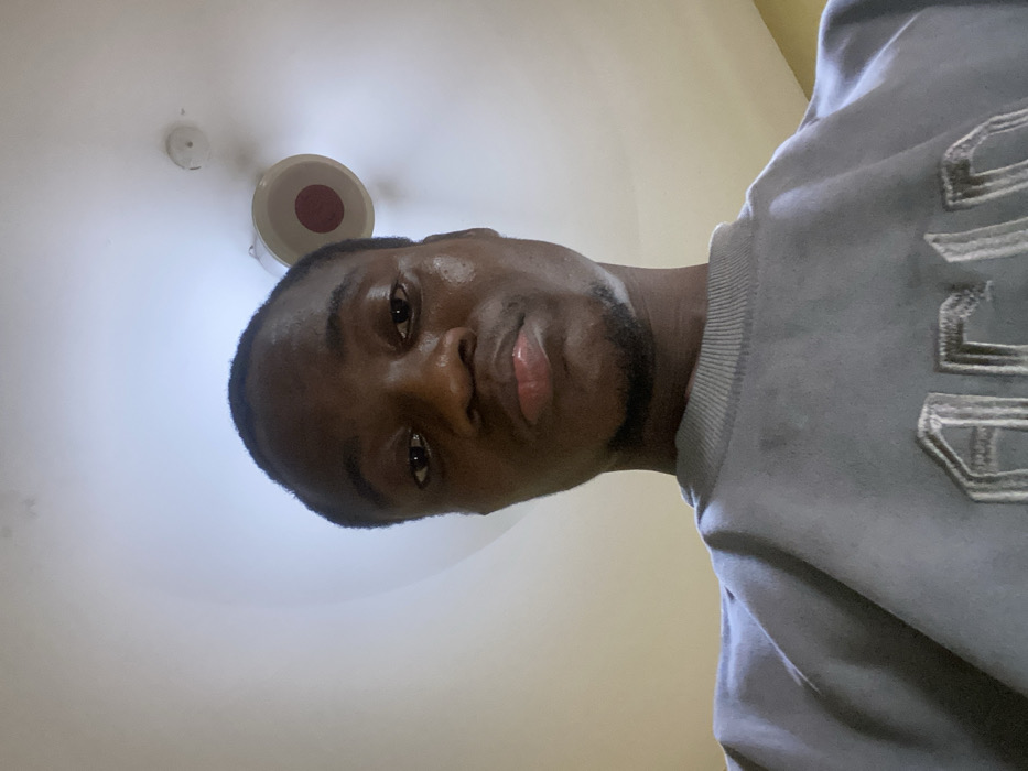 A young adult male with dark skin, short dark hair, and a patchy goatee is depicted in a low-angle, head-and-shoulders shot